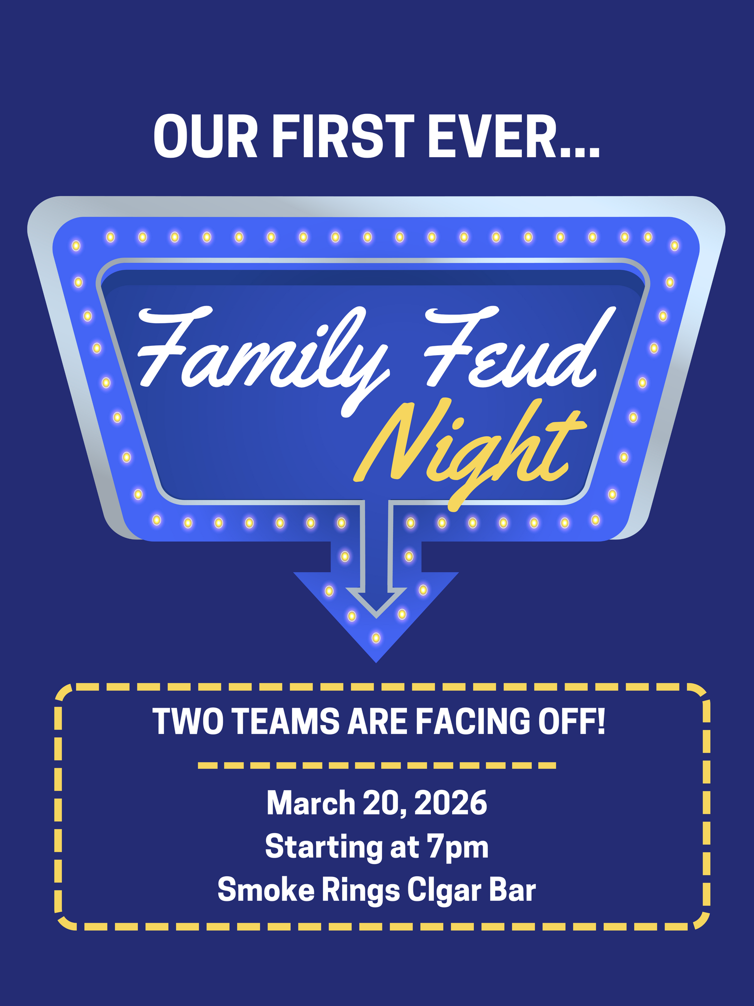 - Family Feud Night - DEBUT! - Friday, March 20, 2026 starting at 7pm @ Smoke Rings Cigar Bar
