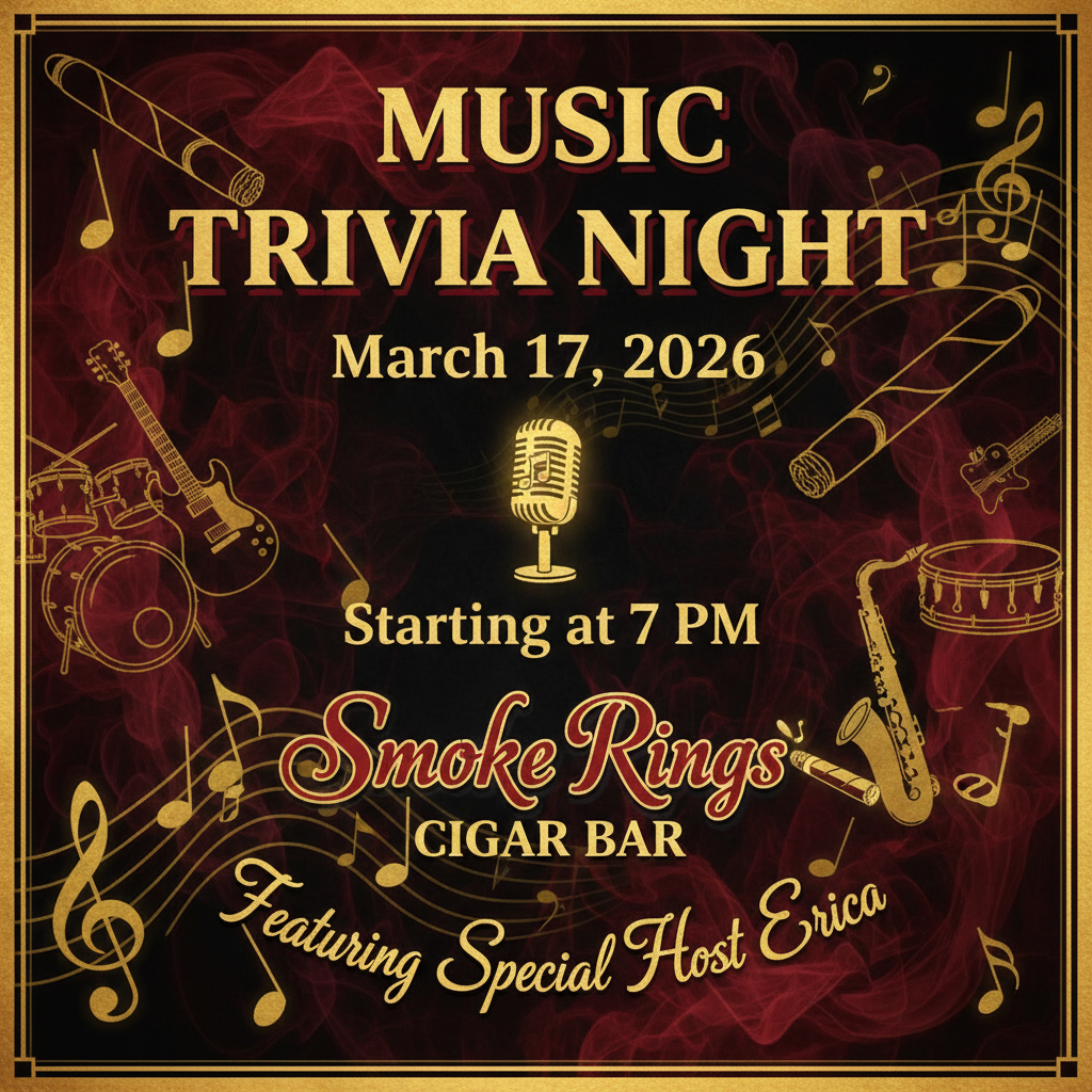 - Music Trivia Night - Tuesday, March 17, 2026 starting at 7pm @ Smoke Rings Cigar Bar