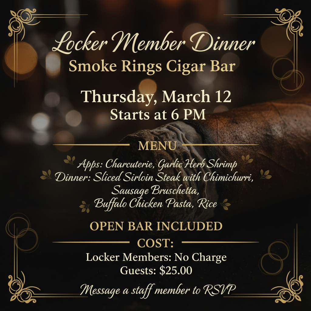 - Locker Member Dinner (ONLY LOCKER MEMBERS) - Thursday, March 12, 2026 starting at 6pm @ Smoke Rings Cigar Bar (How to Become a Locker Member: https://smokeringscigarbar.com/lockers/)