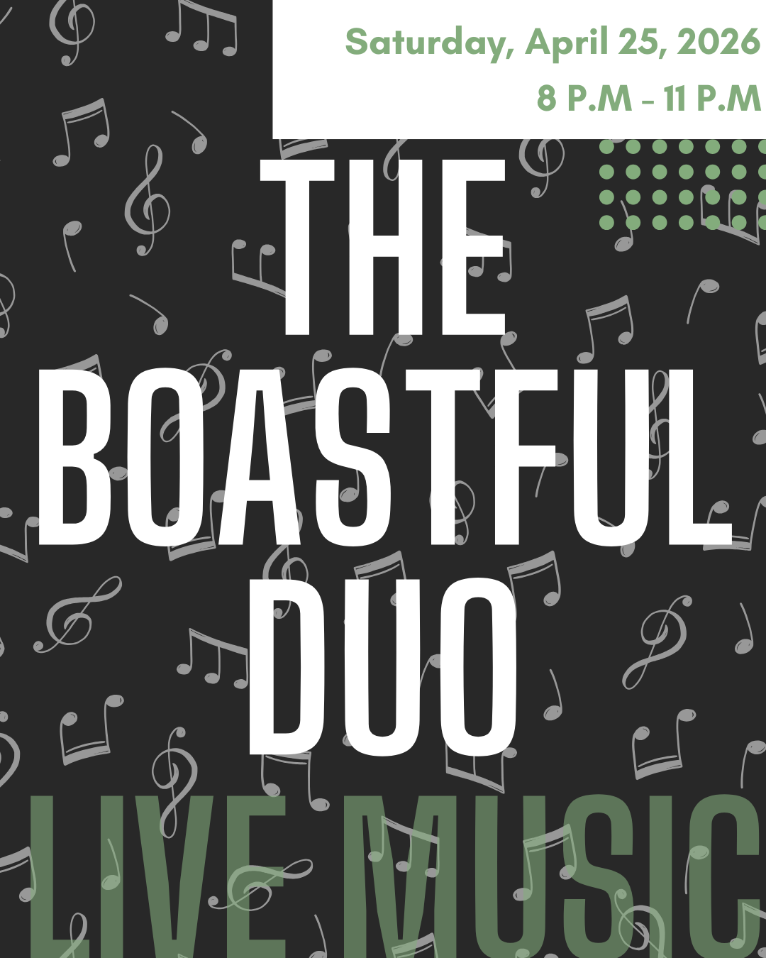 - FOOD TRUCK/LIVE MUSIC: Saturday, April 25 - Food Truck starting at 4pm - Live Music at 8pm