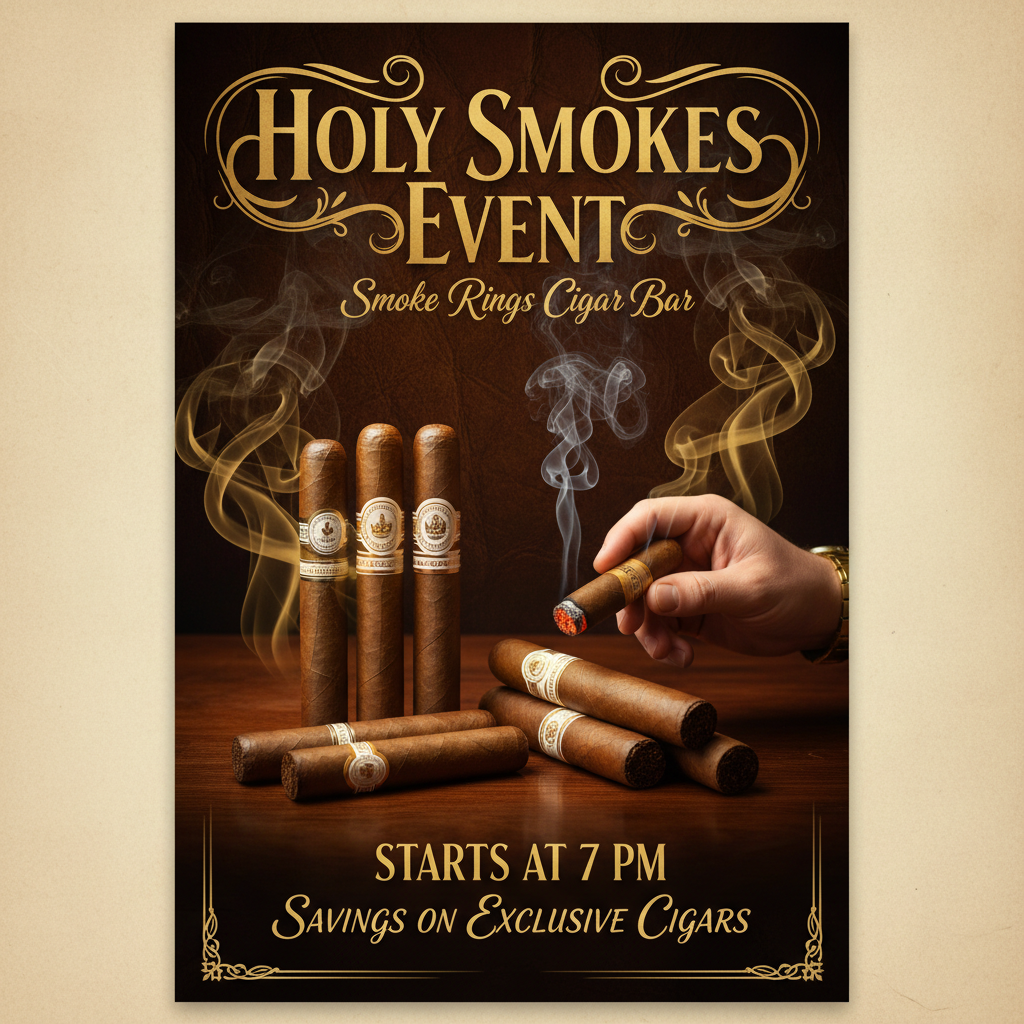 - HOLY SMOKE CIGAR EVENT - Come join us for exclusive cigar deals, starting at 7pm @ Smoke Rings Cigar Bar
